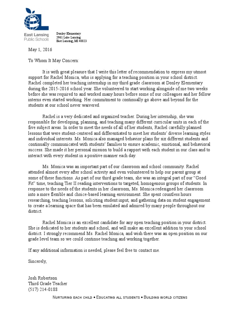 Sample Letter Of Recommendation For Student Teacher Elementary